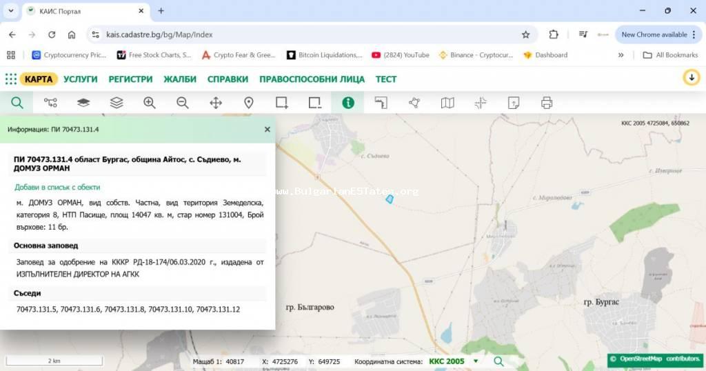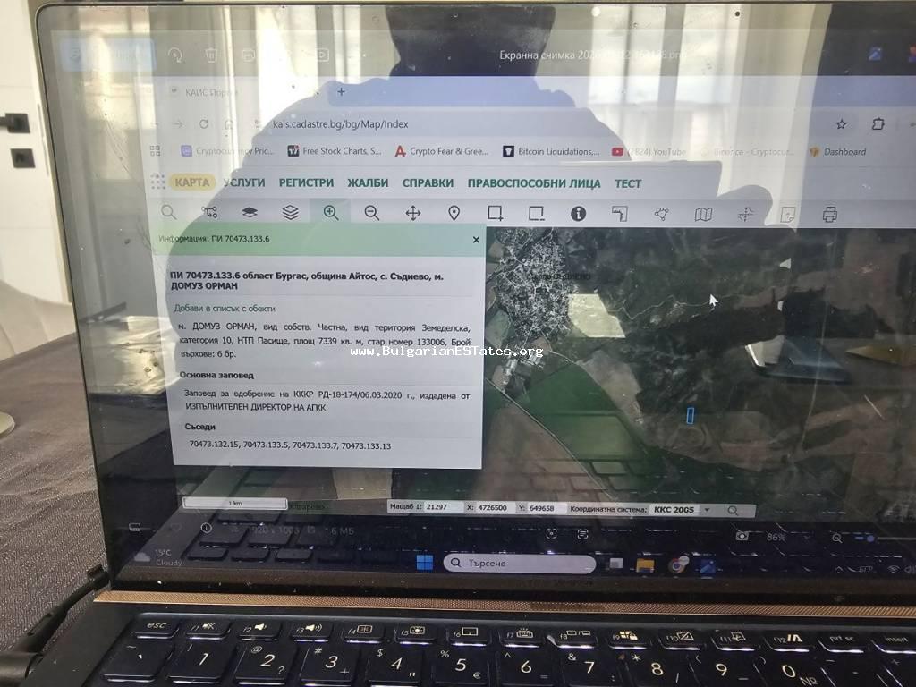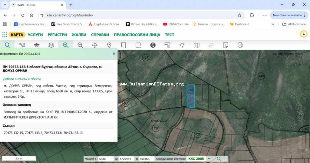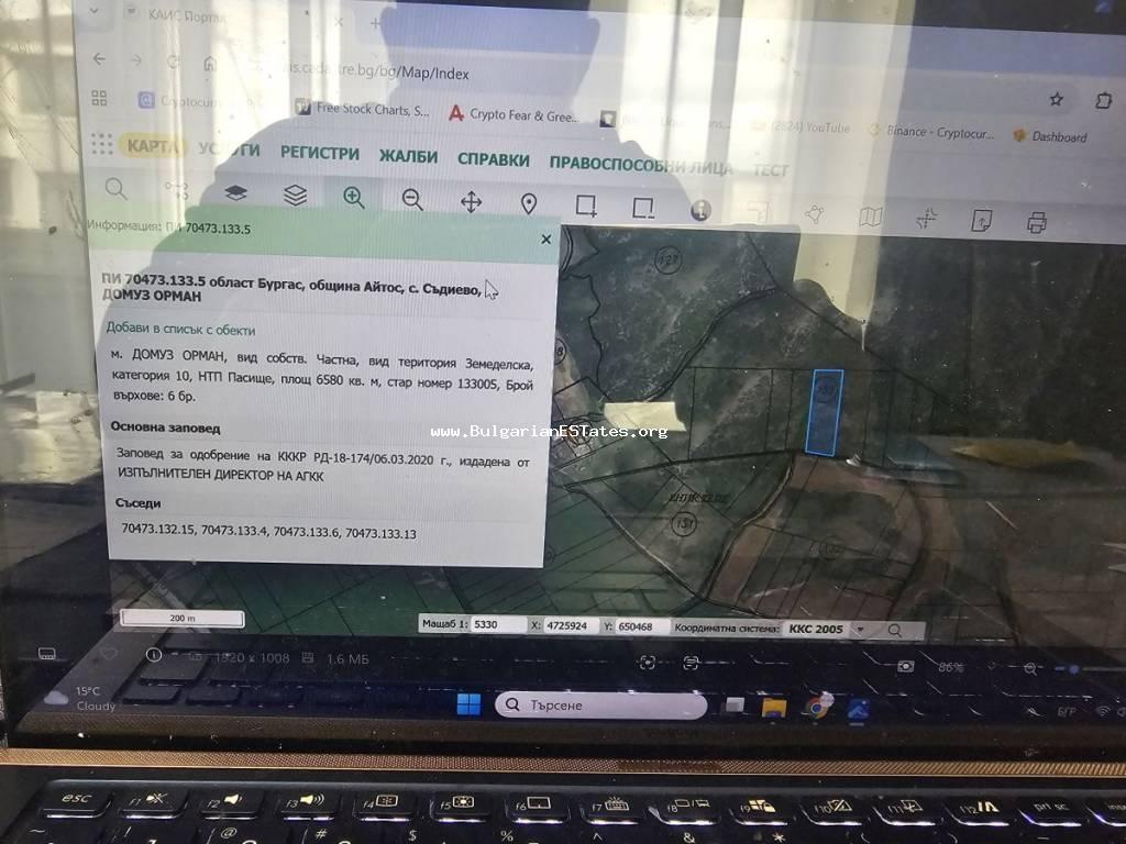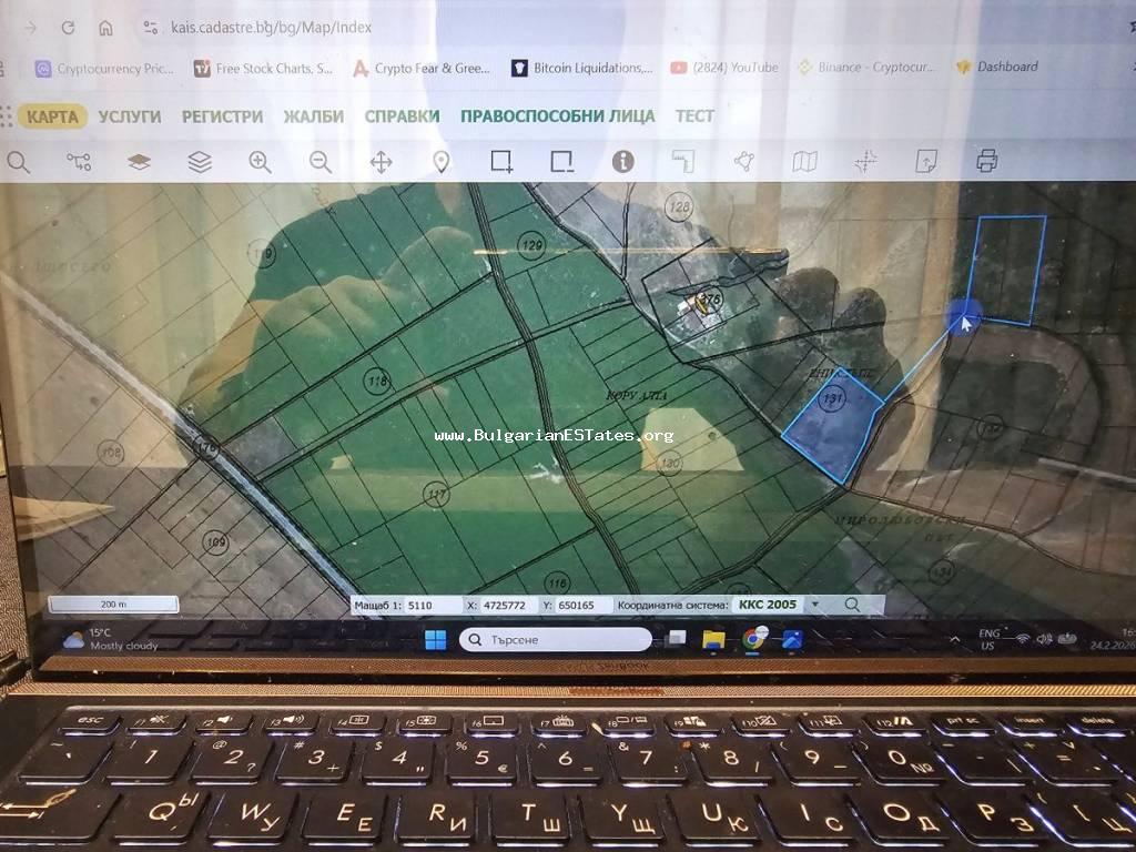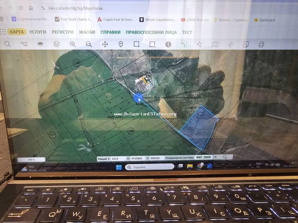 14,047 sq.m and is situated approximately 600 m from the main road between the town of Aytos and the city of Burgas. About 200 m from it there are two additional neighbouring plots with areas of